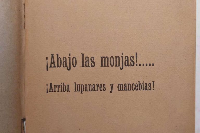 Otro libro fascinante que tienen disponible es ¡Abajo las monjas! … ¡Arriba los lupanares y mancebías!, escrito en 1910. El autor fue Higinio Ciria y Nasarre, quien era historiador y archivero en Madrid. Además, estuvo afiliado al Partido Católico, un partido político de ideología reaccionaria. Tras difundir sus ideas sufrió persecuciones por parte de la justicia.