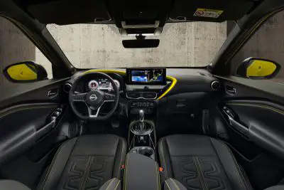 Como con el nuevo diseño de los asientos con acabados en Alcantara reciclado de color amarillo, a juego con la nueva pintura exterior, que cubre parte del reposacabezas. La base y el respaldo del asiento están acolchados con un nuevo patrón distintivo, con la palabra «Juke» grabada a la altura de los hombros. Las costuras amarillas completan este atrevido efecto. El interior presenta un perfil amarillo a juego, con forma de boomerang, que recorre la parte superior del panel de instrumentos, antes de inclinarse hacia abajo y enmarcar la base de la nueva pantalla central de información y entretenimiento, y terminar en las salidas de aire.