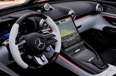 Muchos otros elementos son también un homenaje al automovilismo. Las dos palas situadas detrás de los asientos llevan el emblema AMG y recuerdan a coches de carreras legendarios como el 300 SLR, el coche que Stirling Moss y Denis Jenkinson condujeron hasta la victoria en la Mille Miglia (una carrera de 1.000 millas) de 1955 en Italia. El PureSpeed se presenta en un exclusivo acabado Silver Arrow en mystic silver mango.